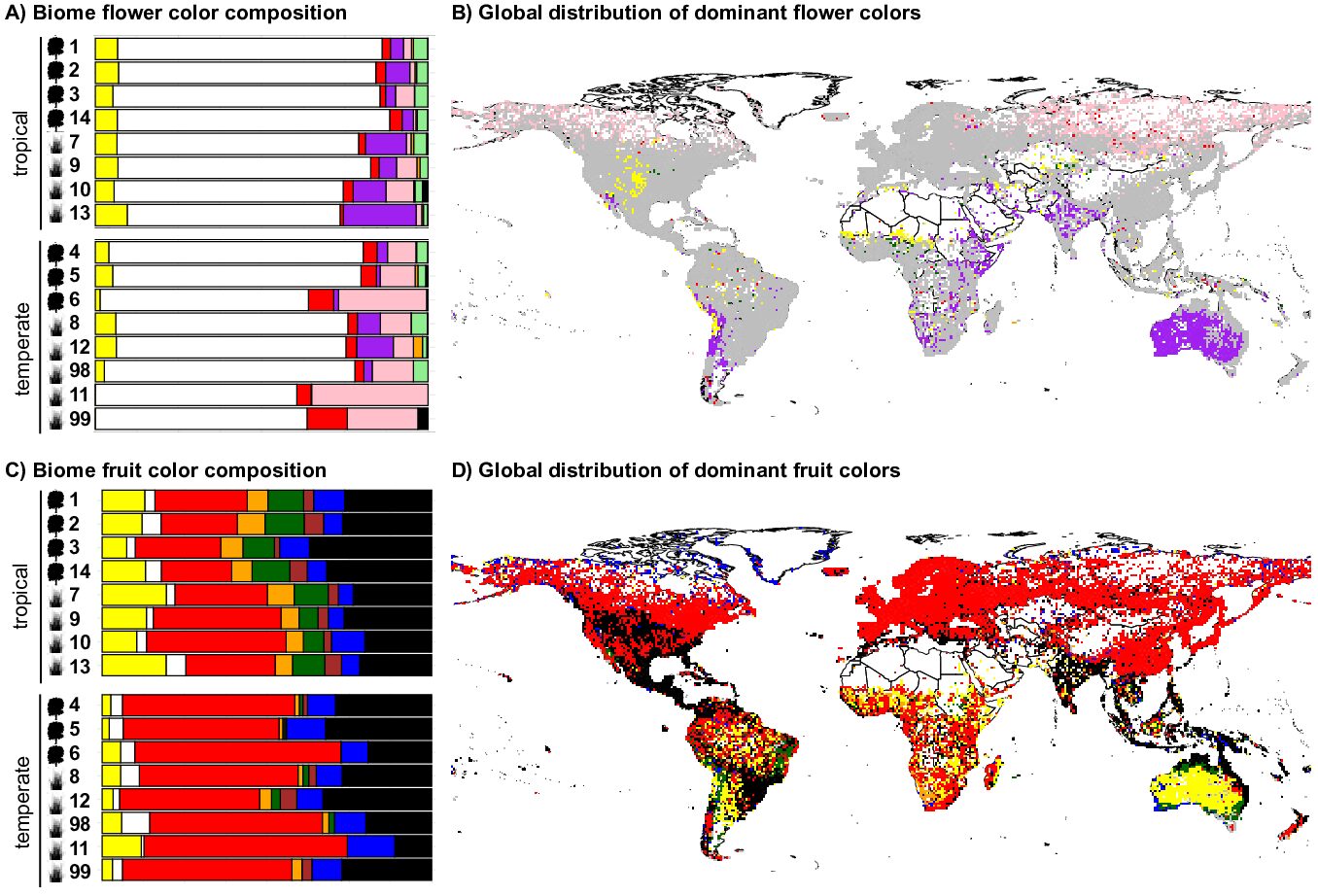Focusing on flower and fruit color, we have found that flowers use fundamentally differnet colors than fruits, and that they differ in their geographic distribution – white flowers are common throughout, but pink flowers are more common in temperate environments, while yellow and purple flowers are more common in dry environments. Most red fruits are found in the temperate zone, while black fruits are common in tropical rainforests, and yellow fruits are common in warm, dry environments. Further, plant clades seem to invest into either diversifying their flower or their fruit colors, pointing towards exciting trade-offs, which we are investigating in ongoing projects.