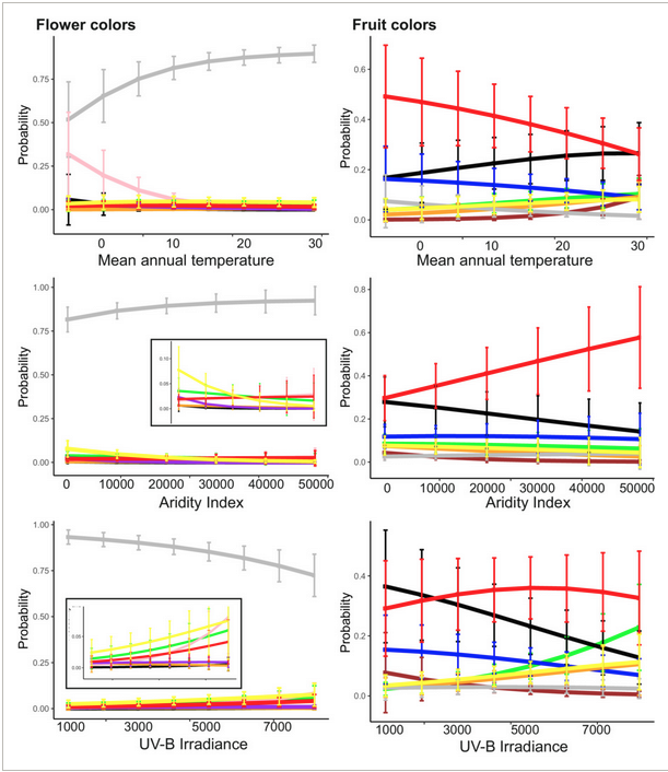 Similarly, our assessment of the global distribution of flower and fruit colors across 51 plant clades (>2800 species) revealed that flower and fruit colors are not randomly distributed across the globe, but actually show significant associations with distinct abiotic environmental variables. While white is the most common flower color, non-white flowers are more common in environments of high abiotic stress, with pink and red flowers more common in cold environments, and yellow and purple flowers being more common in dry and sun-exposed environments. These findings hint to an important role of color pigments in flowers as mediating abiotic stress, besides being attractive to pollinators (and humans). Similarly, in fruits, red and black are the most common colors, with red fruits being particularly common in cold environments, while black fruits are most common in tropical forests. Dull-colored fruits (green, yellow, brown, orange) are more common in warm environments with high sun exposure. These lighter colors may function as desiccation avoidance in hot, dry environments.